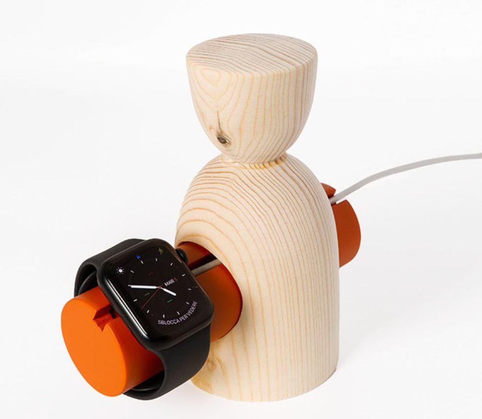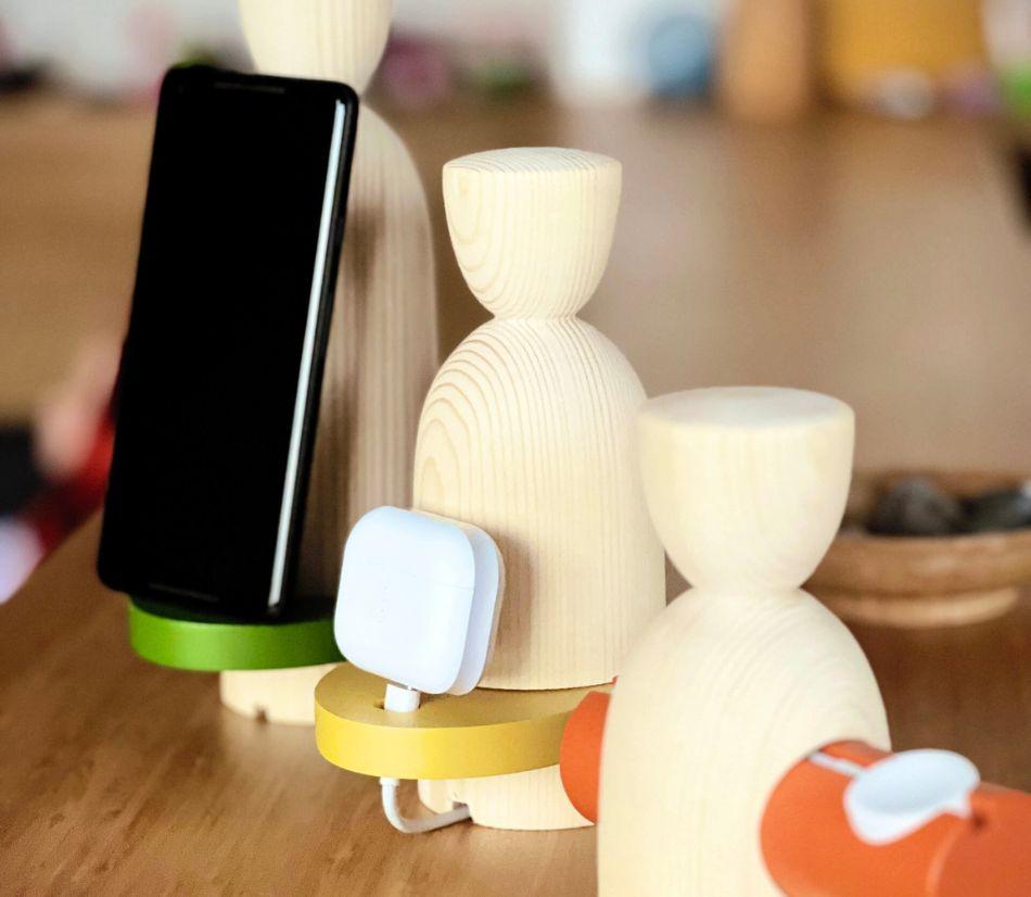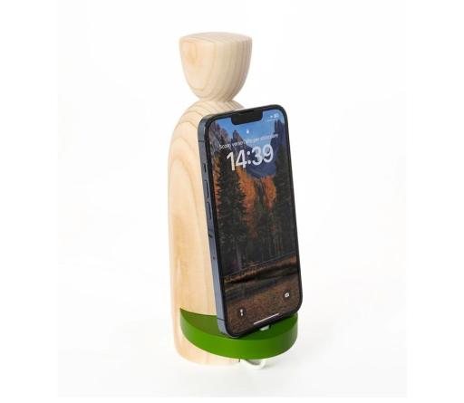 VAIA People è più di una docking station: è un simbolo di connessione tra persone, natura e tecnologia. Realizzata con legno di recupero e lavorata da artigiani locali, la sua forma stilizzata di due figure umane rappresenta l’energia dei legami autentici e la forza della comunità. Composta da due elementi dedicati a smartphone e Apple Watch, unisce design, funzionalità e valore sociale.
