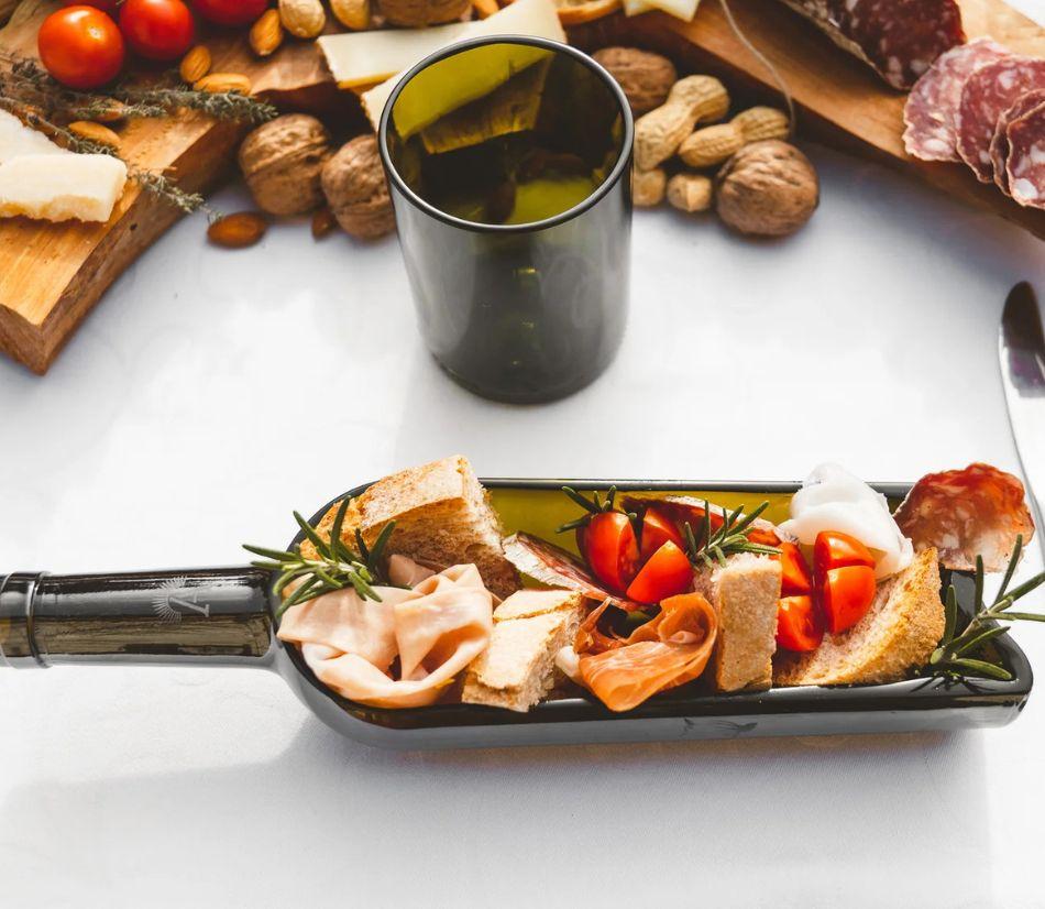 Scopri l'unicità del vassoio con collo di vetro riciclato, un capolavoro di design che fonde estetica e responsabilità ambientale. Realizzato attraverso il taglio longitudinale di bottiglie di vino, questo vassoio non è solo un oggetto di stile, ma un esempio tangibile di come il riciclo possa dar vita a prodotti di elevata qualità.