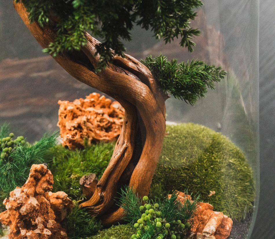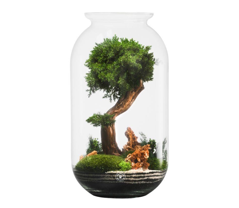 Con una combinazione di rocce, legno, piccole pietre, muschio ed esemplari di Bonsai di ginepro stabilizzati, il terrario Wide L regala un'atmosfera suggestiva e rilassante, perfetta per creare angoli di giardino all'interno dei tuoi spazi abitativi o lavorativi.