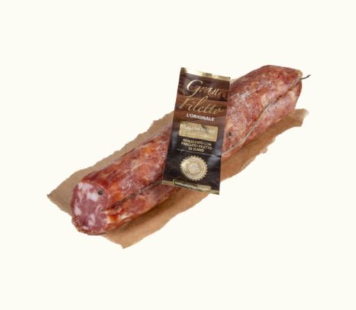 Salame dall’autentico sapore, ottenuto da purissimo filetto di maiale italiano, selezionati tagli di carne suina italiana, sale, pepe e una accurata scelta di aromi. Unione di tradizione gustativa e innovativo metodo produttivo.