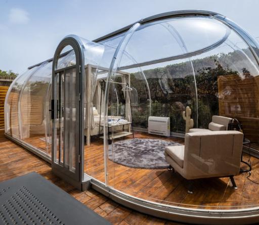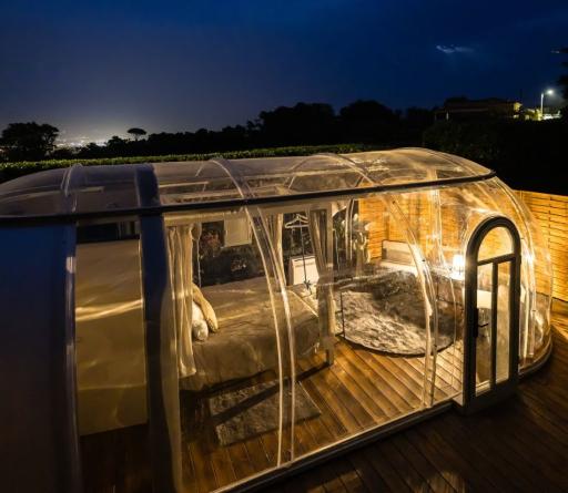 Dormi sotto le stelle, avvolto dalla magia: immagina di addormentarti sotto un cielo stellato, circondato solo dal silenzio della natura e dal comfort di una suite trasparente, intima, romantica.