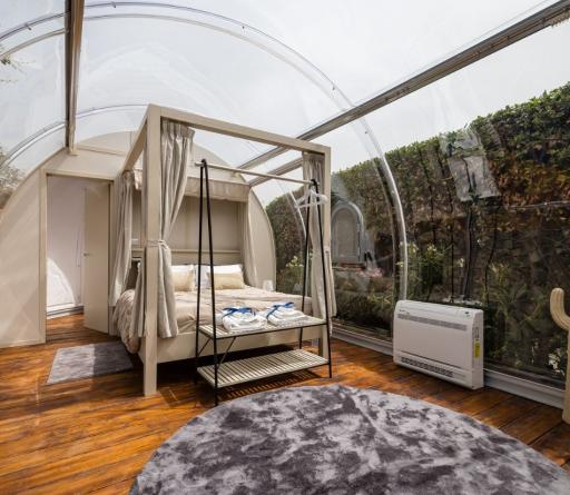 Dormire in una bolla significa vivere un contatto puro con la natura, senza rinunciare ai comfort di un'accogliente camera d'albergo. La Bubble Suite, dotata di aria condizionata di ultima generazione, ti accoglie con un letto comodo, biancheria fresca, asciugamani e saponi naturali, in un'atmosfera intima e sospesa nel silenzio. Di notte, le stelle saranno il tuo soffitto, mentre tutto intorno regna solo la quiete degli ulivi.