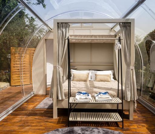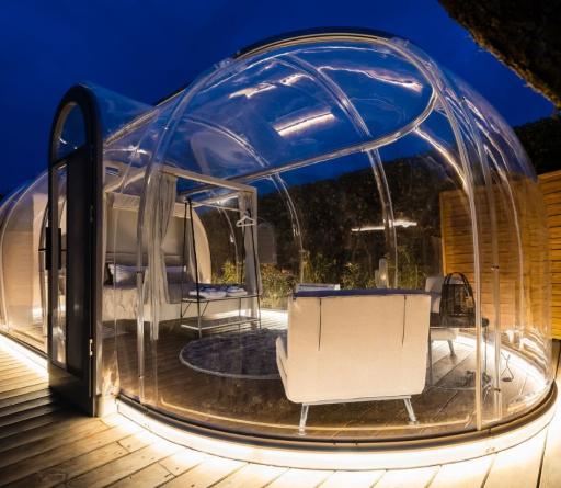 Dormi sotto le stelle, avvolto dalla magia: immagina di addormentarti sotto un cielo stellato, circondato solo dal silenzio della natura e dal comfort di una suite trasparente, intima, romantica.