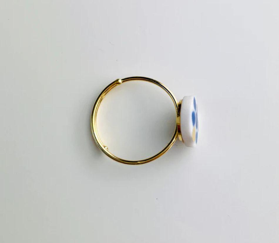La più semplice e pura dichiarazione d'amore. La bellezza minimalista di questo anello è esaltata dal dettaglio della piastrella in porcellana dipinta a mano e rifinita con la calda luce dell'Oro Puro.