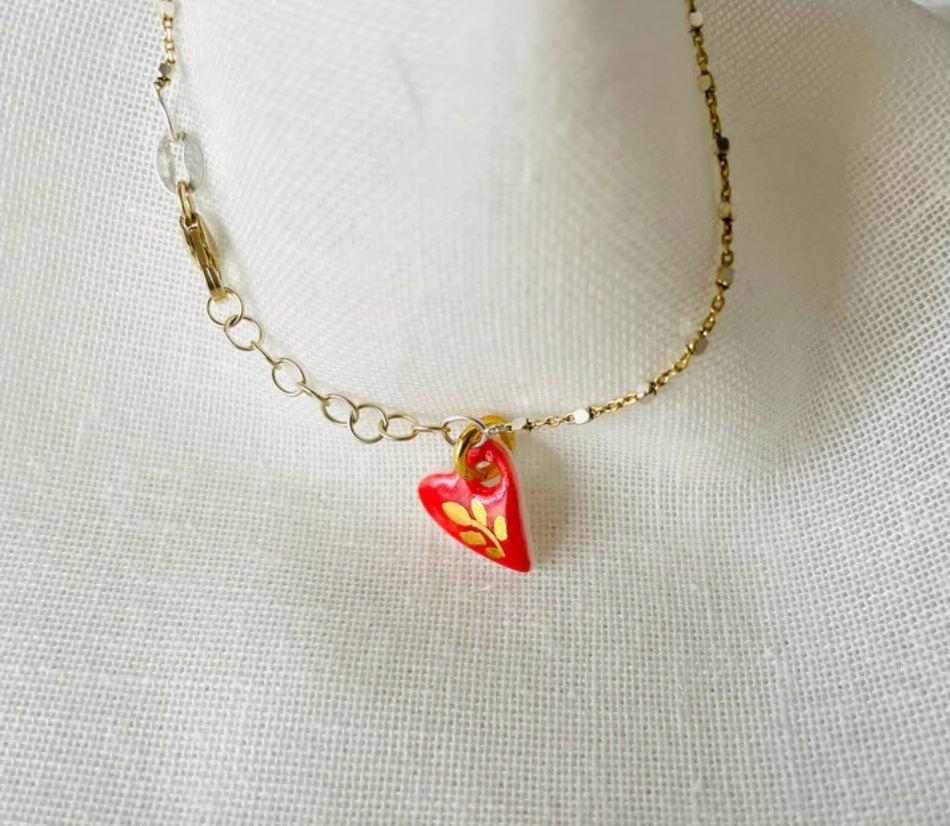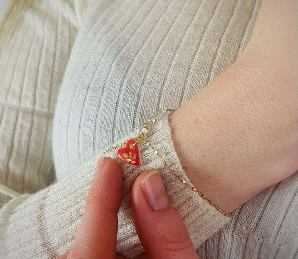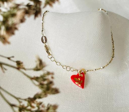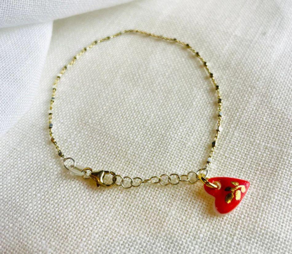 Elegante bracciale in argento 925 placcato oro 24k, con ciondolo a cuore in porcellana bianca. Il decoro colorato e le foglie in oro zecchino puro lo rendono un gioiello raffinato e unico.
