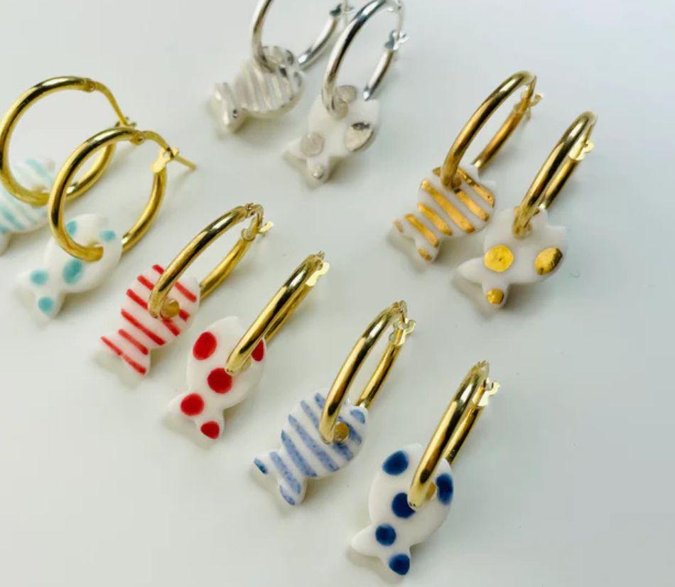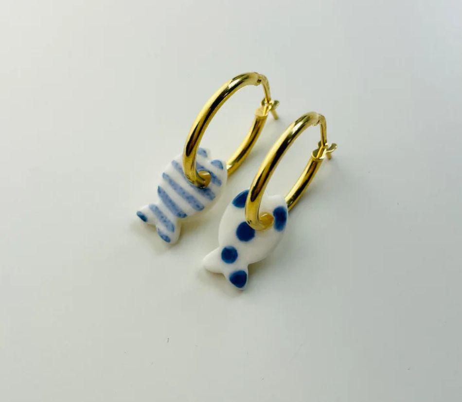 Orecchini con cerchi in argento 925 galvanizzati oro 18k. Il pendente a forma di pesce in porcellana bianca è decorato con righe e pallini colorati bianco e blu. Freschi e originali.