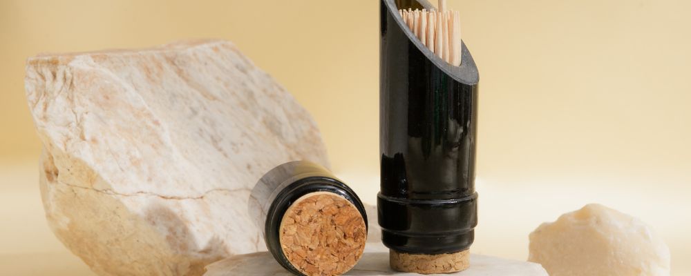 Porta stuzzicadenti ecologico e raffinato, il nostro modello Amarzo in collo di bottiglia di vino riciclata è la scelta ideale per chi cerca accessori per la tavola e per la casa in vetro riciclato senza rinunciare all'eleganza.