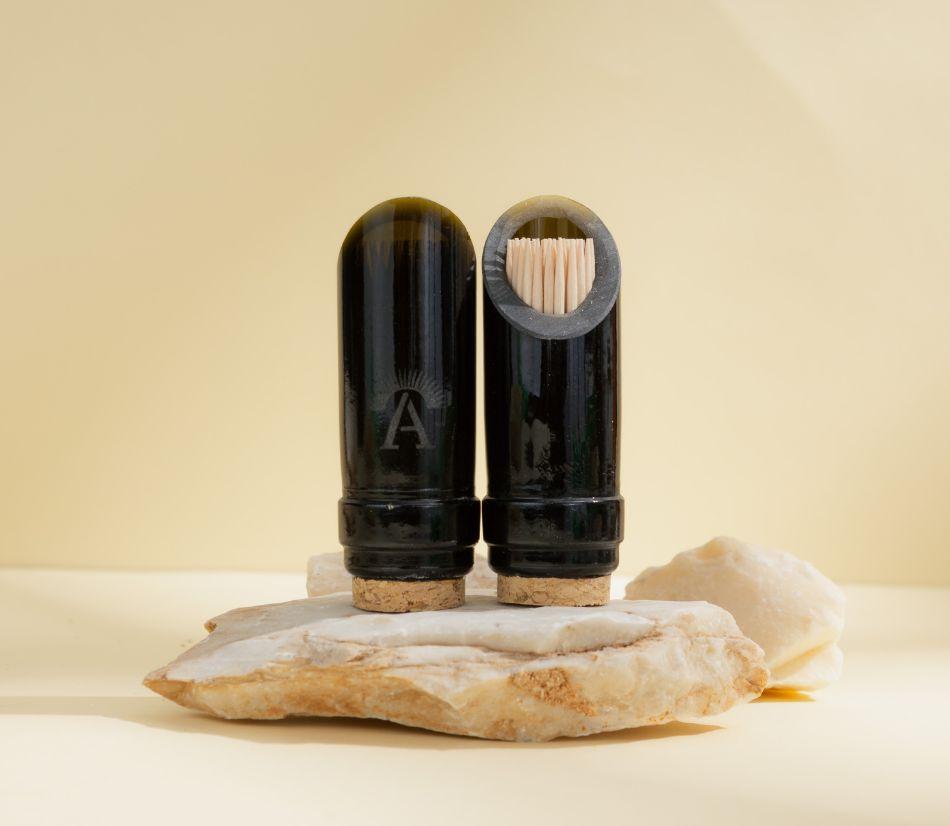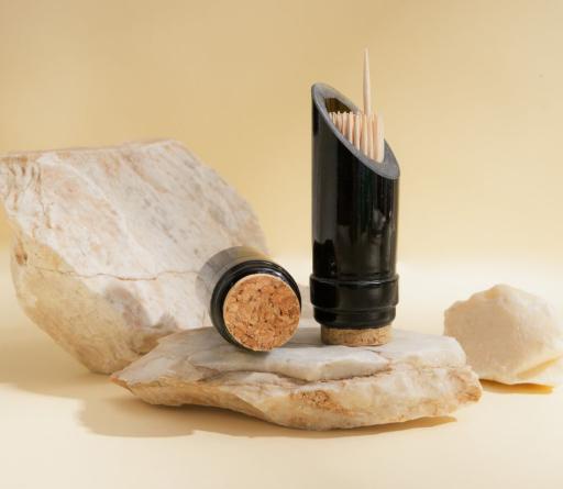 Porta stuzzicadenti ecologico e raffinato, il nostro modello Amarzo in collo di bottiglia di vino riciclata è la scelta ideale per chi cerca accessori per la tavola e per la casa in vetro riciclato senza rinunciare all'eleganza.