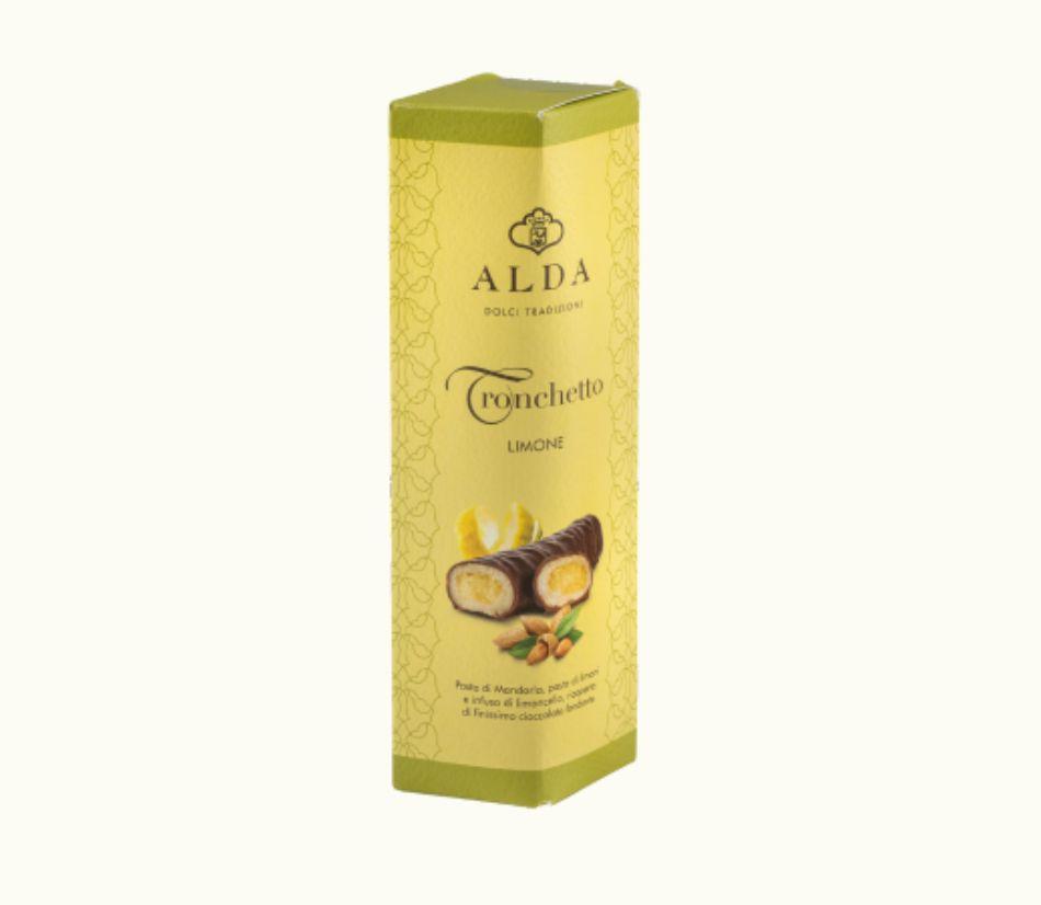 Tronchetto con pasta di mandorle pugliesi, infuso limoncello e ricoperto di cioccolato fondente – Alda – Astuccio 90 g