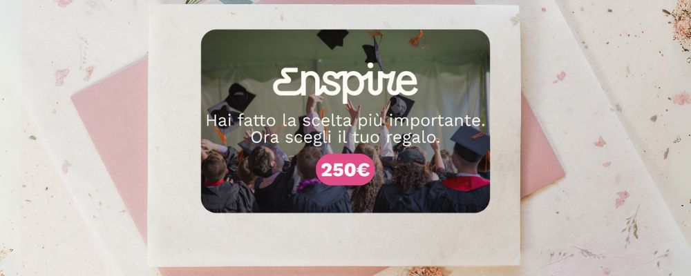 Regalare non è mai stato così semplice: con la Gift Card Enspire con tema laurea da 250€ chi la riceve potrà scegliere tra oltre 500 prodotti ed esperienze uniche presenti sul nostro shop. Un dono speciale che lascia libertà senza essere banale, il passepartout ideale quando vuoi sorprendere senza rischiare di sbagliare il regalo per la laurea.