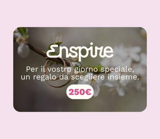 Regalare non è mai stato così semplice: con la Gift Card Enspire con tema Matrimonio da 250€ chi la riceve potrà scegliere tra oltre 500 prodotti ed esperienze uniche presenti sul nostro shop. Un dono speciale che lascia libertà senza essere banale, il passepartout ideale quando vuoi sorprendere senza rischiare di sbagliare il regalo per il matrimonio.